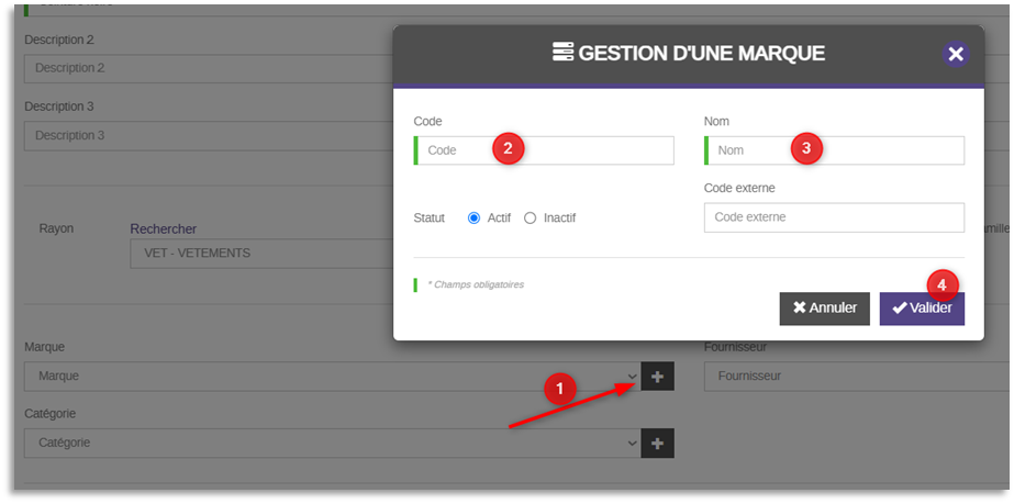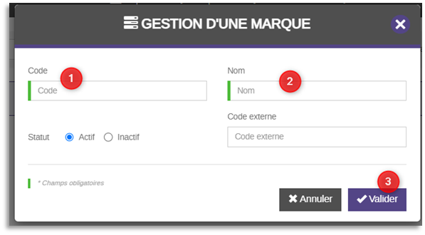 Les Marques peuvent être crées directement depuis la fiche article grâce au bouton « + » ou via le menu Articles > Marques.