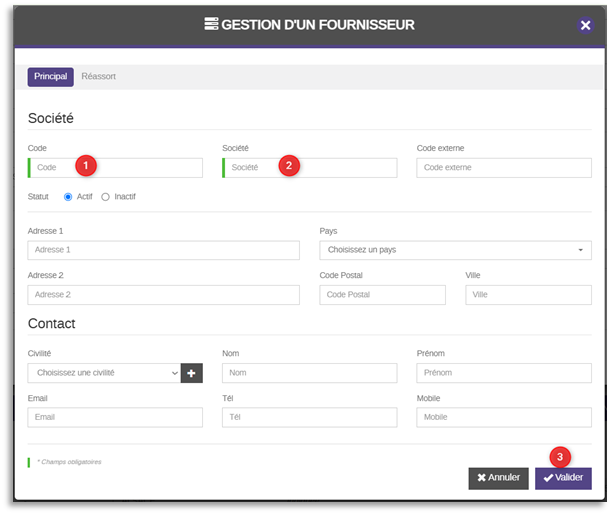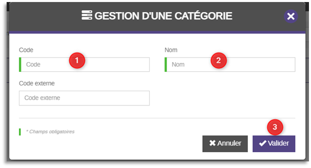 Saisissez un code (5 caractères max) et le nom, puis « Valider ». Les autres champs sont facultatifs.
