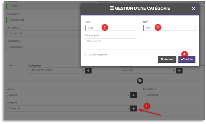 Pour créer une catégorie dans la fiche article : allez dans « Articles », puis cliquez sur « Catégorie». A côté du champ « Catégorie », cliquez sur « + » si dans la liste la catégorie n’existe pas déjà. => Saisissez un code (5 caractères max) et le nom, puis « Valider »