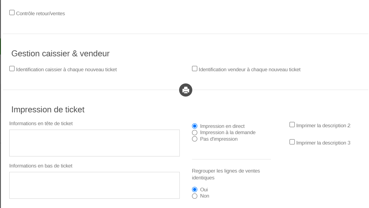 Regrouper les lignes identiques : Regroupe les lignes de ticket identiques en une seule ligne. Au lieu dâimprimer 3 lignes avec 1 coca on imprime 3 COCA. Le regroupement nâest fait que sir les 3 lignes sont rigoureusement identiques, câest-Ă -dire avec le mĂȘme prix et les mĂȘme remises.