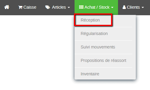 Dans la partie Administration (backoffice) il faut aller dans le « Achats / Stock » puis « Réception »