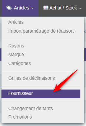 Pour utiliser certaines fonctionnalité des propositions de réassort, certains paramétrages sont nécessaires au niveau des fiches fournisseurs. Pour cela, aller dans le menu Articles > Fournisseur depuis le backoffice.