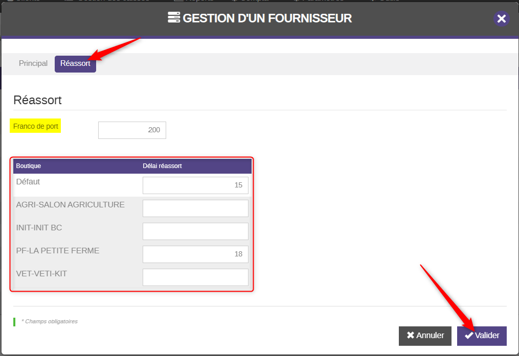 - On peut renseigner le montant Franco de port. Il s’agit du montant de commande à partir duquel le fournisseur prend à sa charge les frais de livraison.
