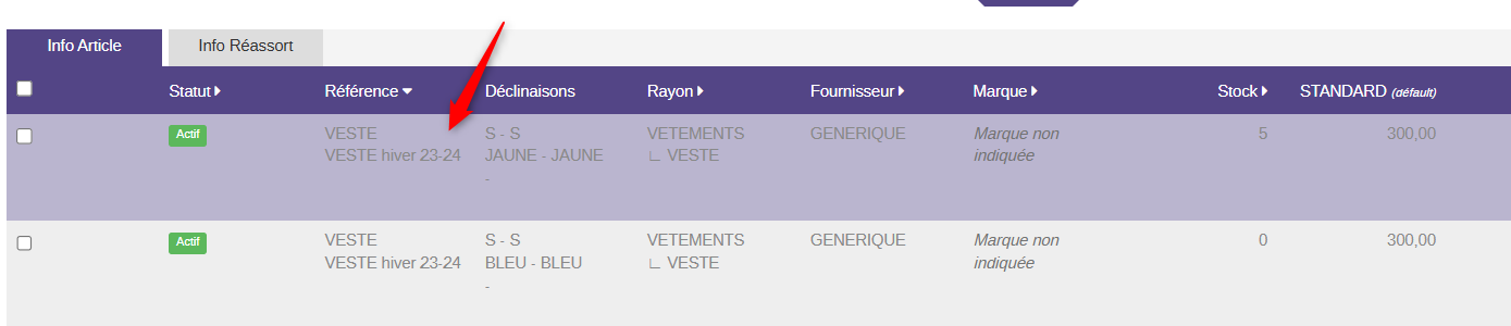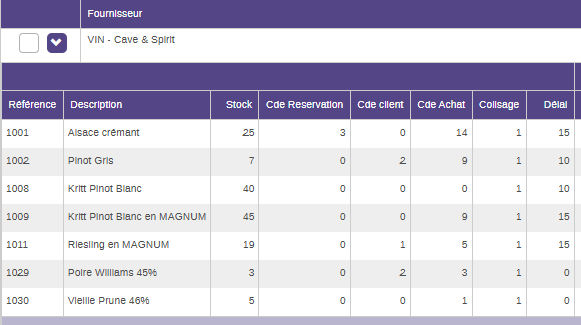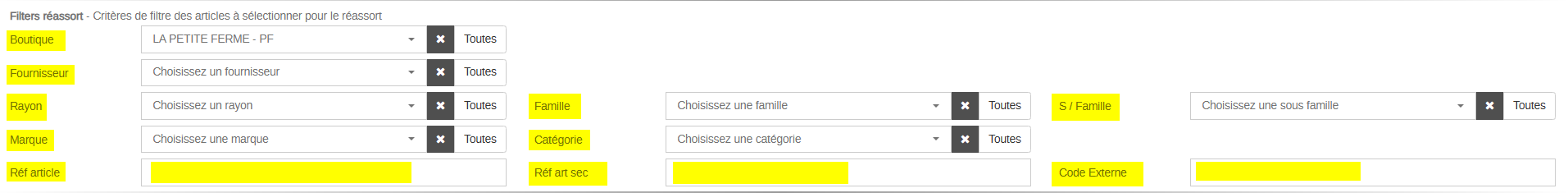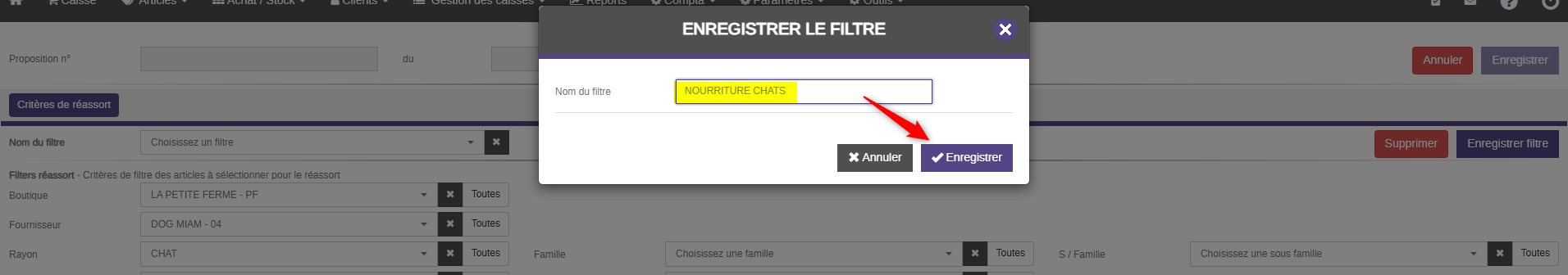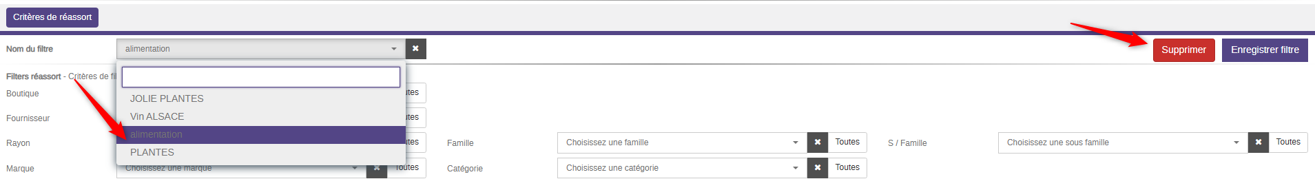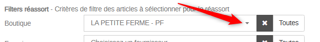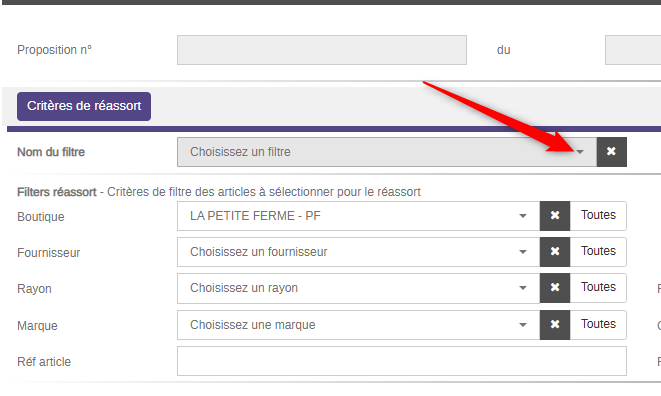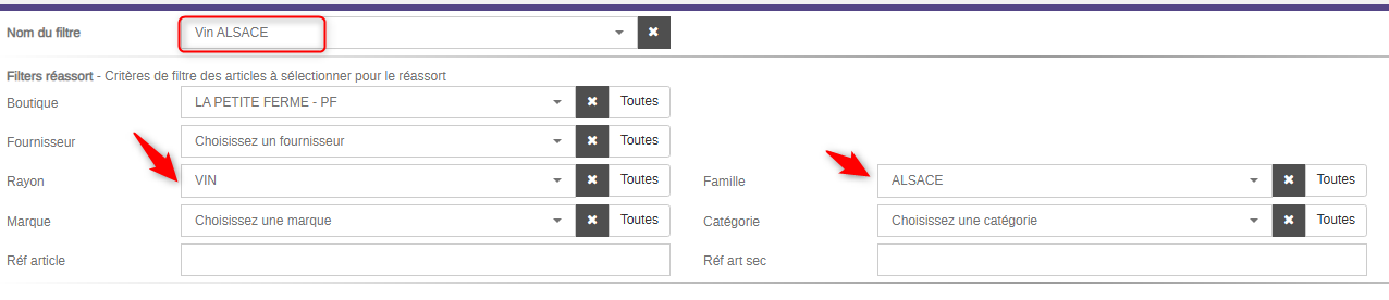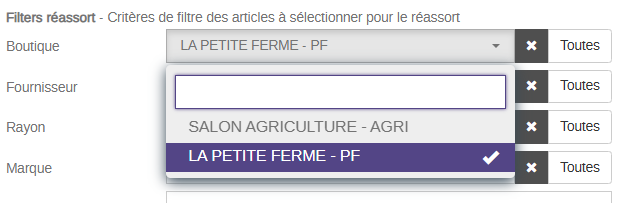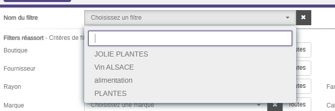 Il est possible de filtrer les articles par exemple pour faire des propositions de réassort par fournisseur, marque ou famille article.