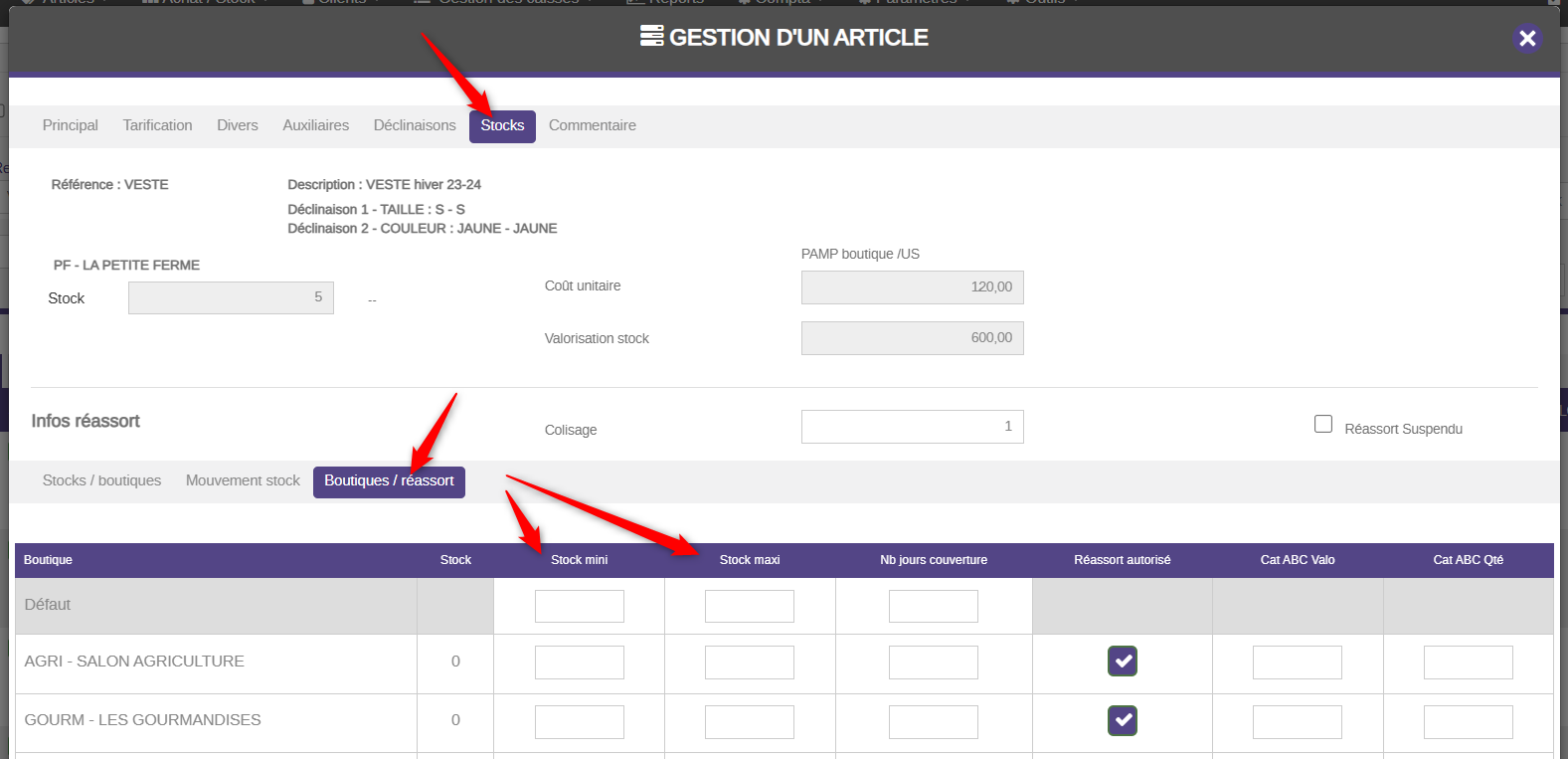 Cliquer sur l’onglet Stocks, puis l’onglet Boutiques / réassort :