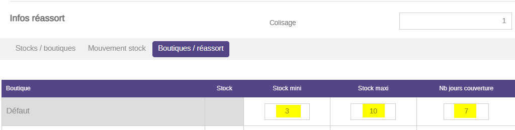 - Stock minimum (mini) : C'est le niveau le plus bas de stock que vous êtes prêt à conserver avant de passer une nouvelle commande. C’est le seuil de déclenchement des propositions de réassort avec la méthode Mini/Maxi. Tous les produits ayant un stock inférieur à ce stock mini seront dans la proposition. - Stock maximum (maxi) : C'est la quantité maximale de produits que vous souhaitez conserver pour éviter le sur stockage. Si le stock de la boutique est inférieur au mini, Clictill propose un calcul pour atteindre cette quantité Maxi.