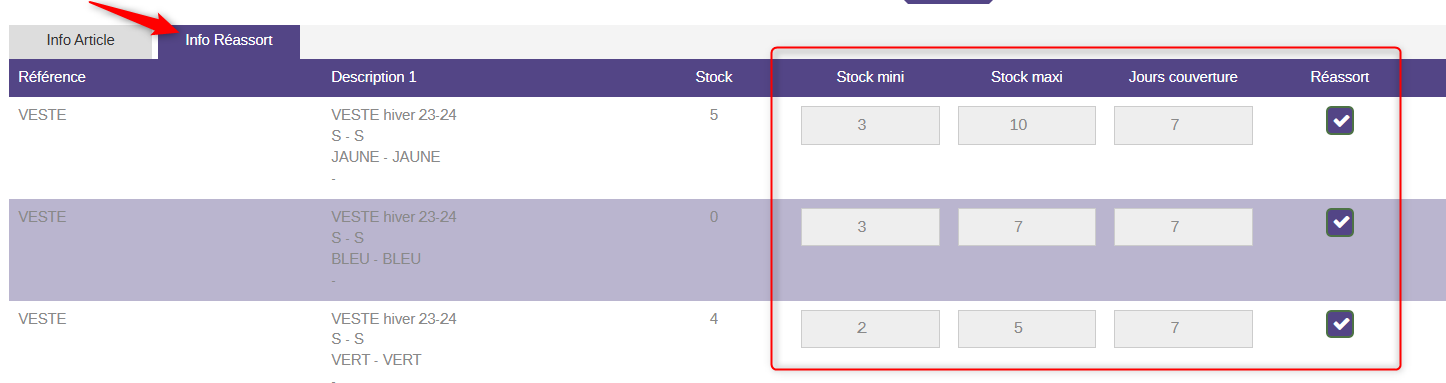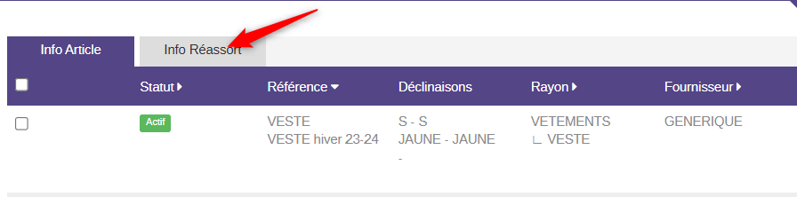 NB : les informations saisies sont visibles dans la recherche articles. Appliquer les filtres, puis dans la liste obtenue, cliquer sur l’onglet “Info Réassort” :