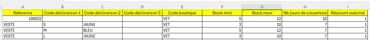 Si on souhaite différencier les mini/maxi et/ou le nombre de jours de couverture par boutique, saisir les quantités sur les lignes correspondances :