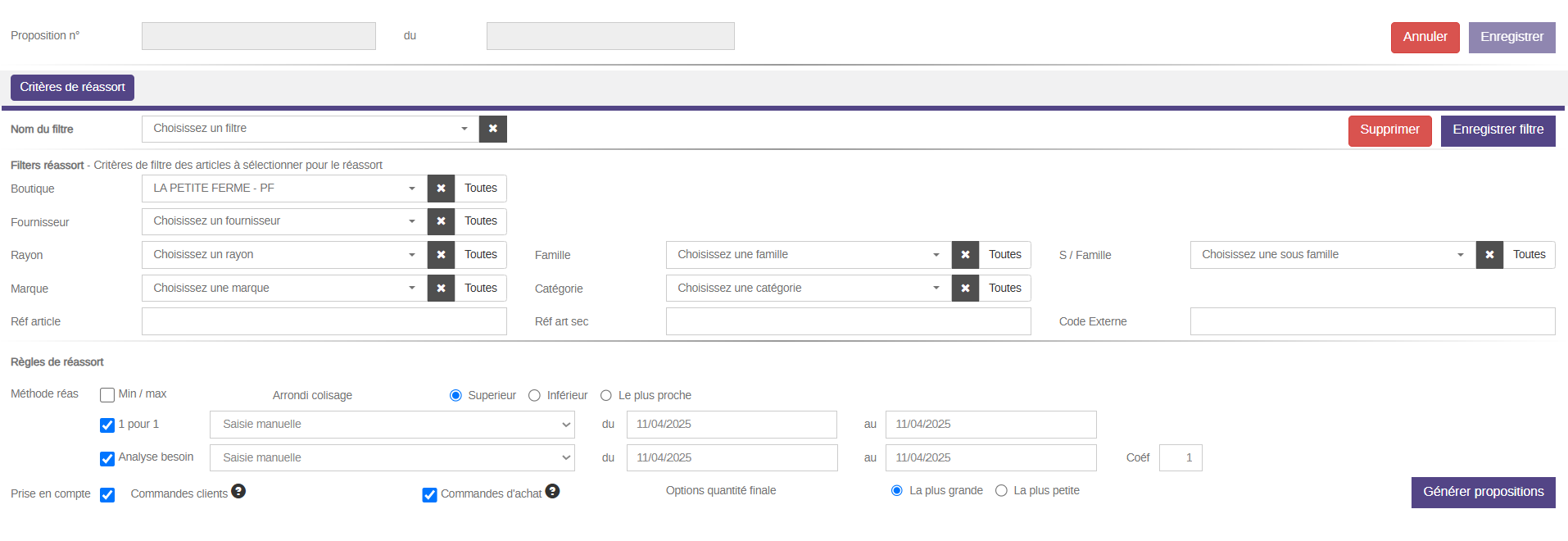 NB : Pour lancer une nouvelle proposition, il suffit de modifier les dates dans les règles de réassort.