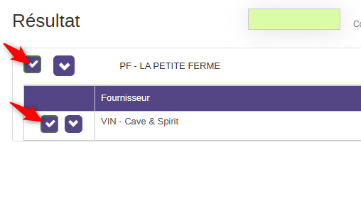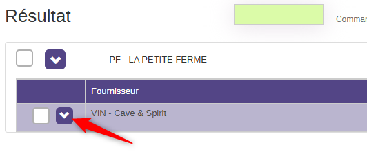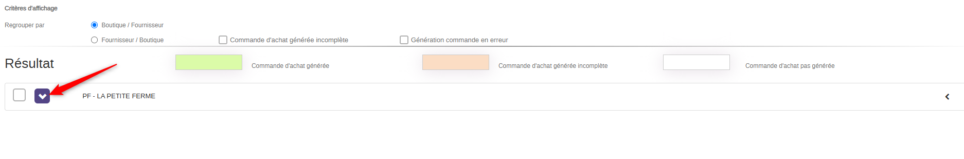 - Pour visualiser les résultats, cliquer sur la ou les flèches correspondant à la boutique ou aux boutiques à analyser, puis sur la ou les flèche(s) correspondant au(x) fournisseur(s) :