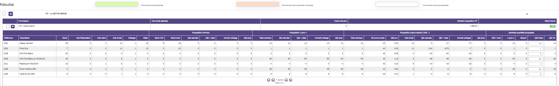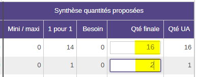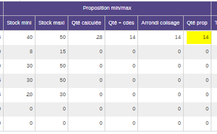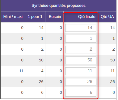 A la fin du tableau de proposition de réassort, on retrouve un tableau de synthèse des quantités proposées (fonction de la ou des méthodes demandées). Les champs de la colonne “Qté finale” peuvent être modifiées.