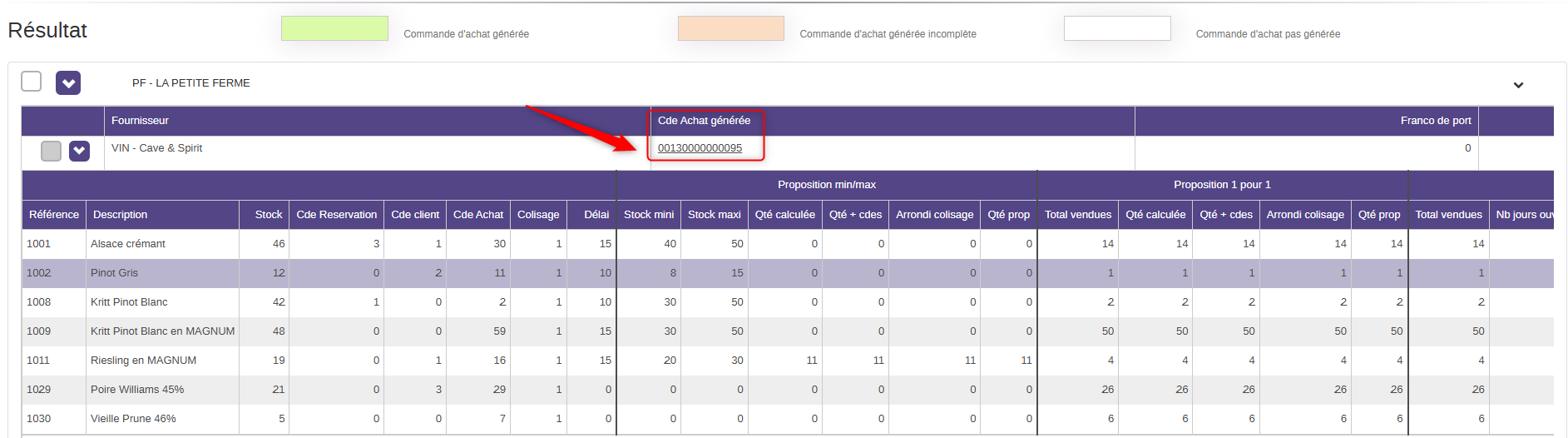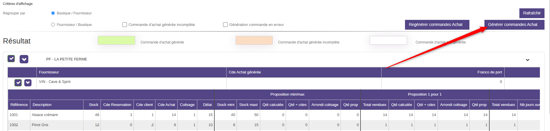 Dans le process, on peut s’arrêter à la proposition de réassort. Cependant il peut être pratique de générer automatiquement une commande d’achat dans Clictill à partir de cette proposition, quitte à modifier les quantités proposées si besoin.