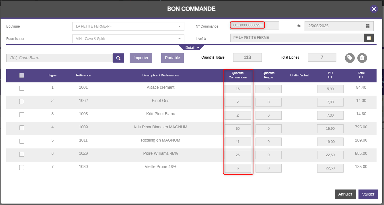Par exemple, si on souhaite modifier les quantités à commander pour le 1er article et le 2eme, il suffit de saisir la nouvelle quantité :