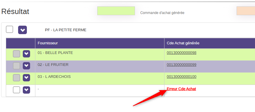 En cliquant sur “Erreur Cde Achat”, les détails sont expliqués pour faire les correctifs nécessaires.