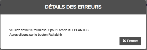 NB : Ce message apparait si le fournisseur n’est pas renseigné dans la fiche article :