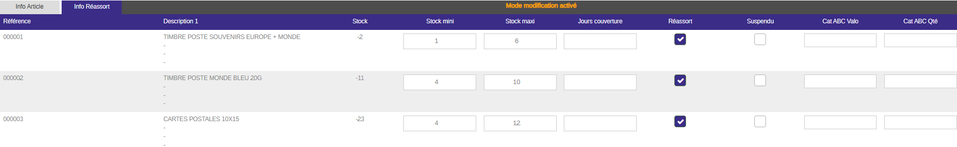 Certaines données (quantités mini/maxi, nombre de jours de couverture, réassort autorisé) liées aux fiches articles sont utilisées dans les propositions de réassort. Il faut donc les renseigner pour pouvoir utiliser correctement le module.