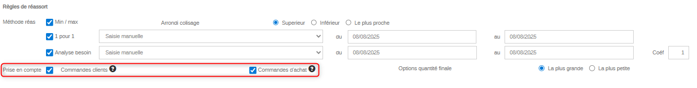 Qté + cdes : quantité calculée qui tient compte des commandes clients en cours (qui viennent augmenter le besoin) et des commandes d’achat en cours(qui viennent le diminuer) . Pour en tenir compte il y a les options correspondantes à cocher au moment de la génération de la proposition de réassort.
