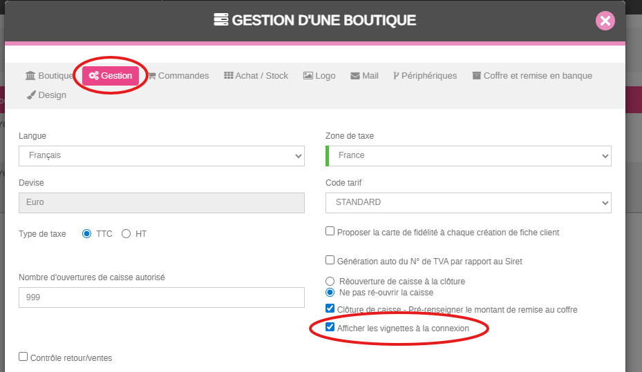 Il est également possible de paramétrer les vignettes de sorte à ce qu’elles apparaissent directement à la connexion au logiciel. Pour ce faire, il faut aller dans le back-office, section Paramètres > Boutiques, puis dans l’onglet Gestion et cocher “afficher les vignettes à la connexion”. Valider ensuite en bas de fenêtre.