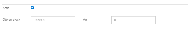 6- Champs divers : pour cette fonction, un champ apparaît pour permettre de définir la plage d’application de la fonction sur les quantités en stock. Ci-dessous, puisqu’on souhaite surveiller les stocks négatifs, on définira une plage allant de -999999 à 0.