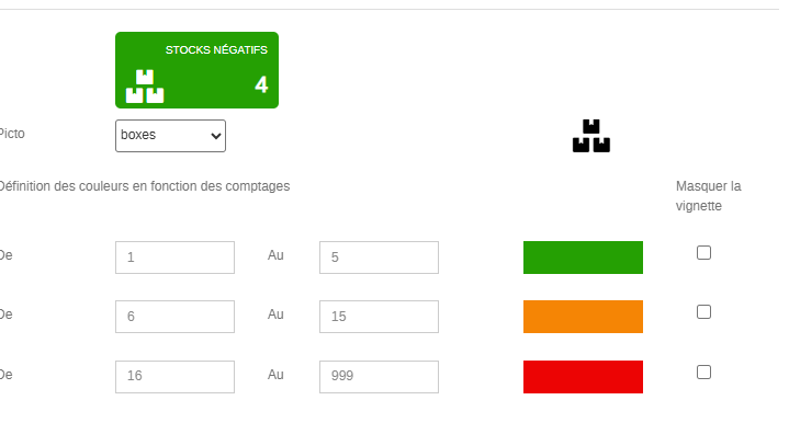 On définit ensuite l’apparence des différents seuils de “gravité” des stocks négatifs. Les champs de seuil concernent ici le nombre de références concernées (et non pas la quantité en stock négatif pour chacune des références). Ci-dessous, la vignette doit se lire comme suit : nous avons, au total, 4 références en stock négatif.