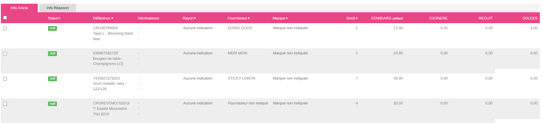 Ce qui est effectivement bien le cas, quand on va rechercher les références en stock négatif directement dans la section Articles :