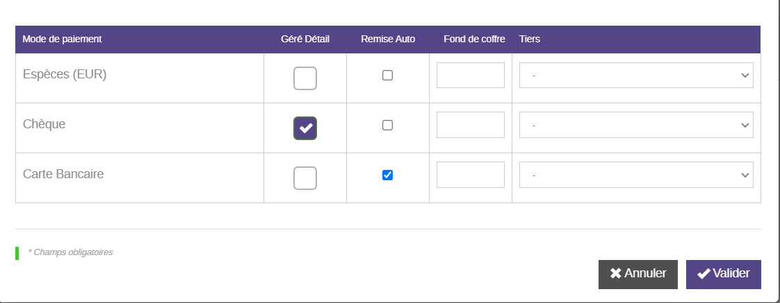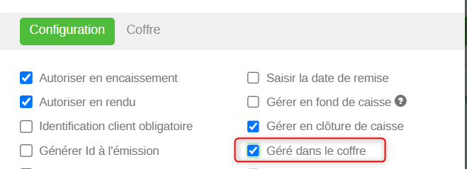 Dans la partie basse, on voit ici certains modes de paiement (Ceux pour lesquels la case ‘Géré dans le coffre’ est coché)