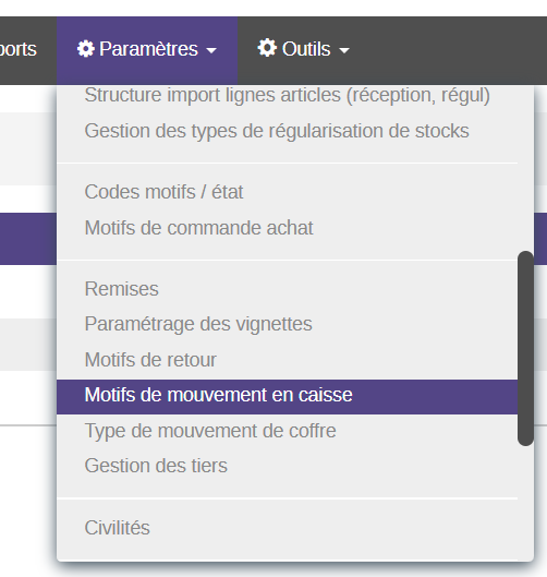 Attention : Si les types de mouvement de caisse ne sont pas renseignés, les opérations de caisses entre la caisse et le coffre ne fonctionnent pas. Il convient donc de les vérifier.