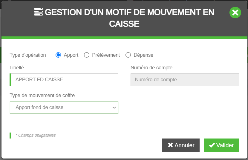 Type d’opération : Tous les motifs créés doivent forcément être rattachés à une des trois catégories (Apport, Prélèvement, Dépense), ici Apport.