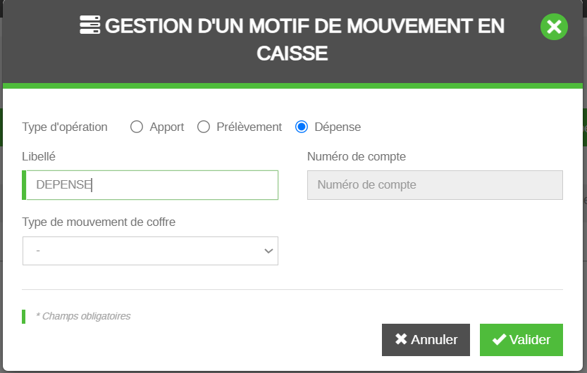Numéro de compte : Champ grisé. Permet de faire figurer pour rappel le numéro de compte comptable utilisé sur ce motif de mouvement de caisse en cas d’utilisation du module de génération des écritures comptable.