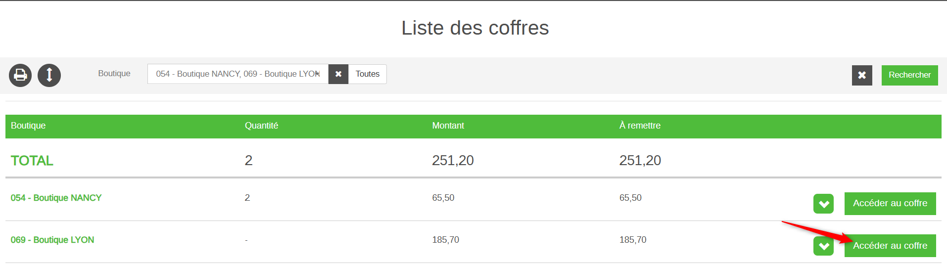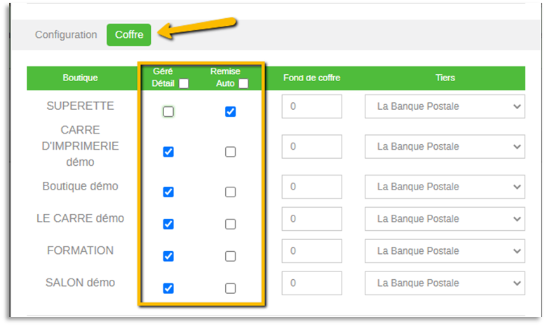 Apparaissent ici les différents coffres dans le cas d’une utilisation sur plusieurs magasins.
