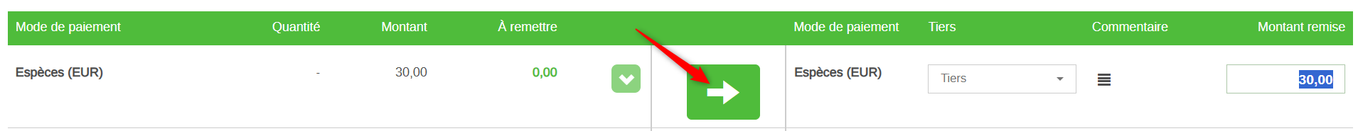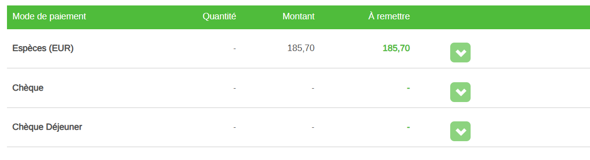 Dans le cas d’un mode de paiement non géré au détail (généralement l’espèce), la flèche verte est inactive.