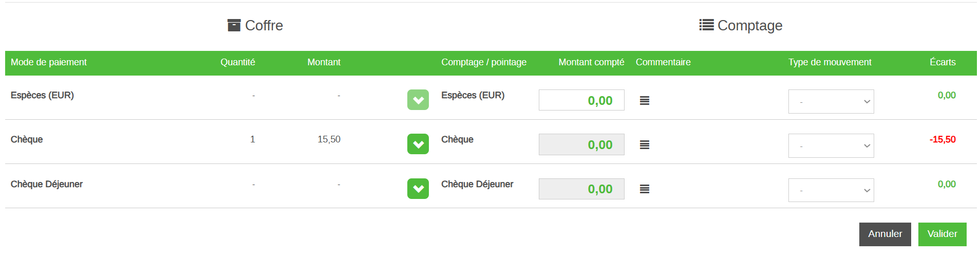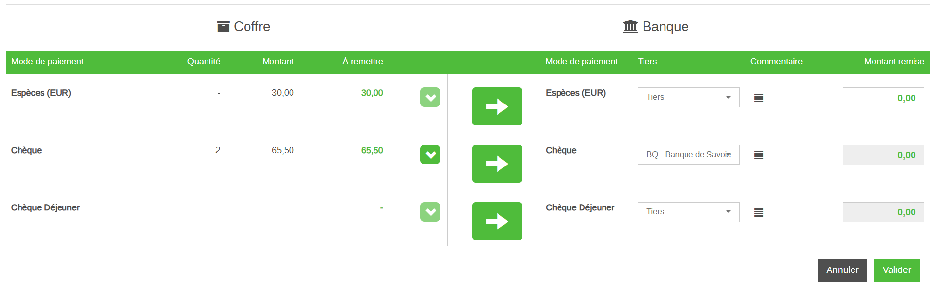 Pour chaque mode de paiement, mouvementé et supérieur à 0, on peut choisir le montant à remettre en banque