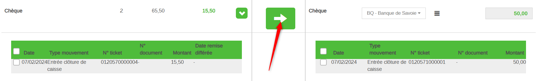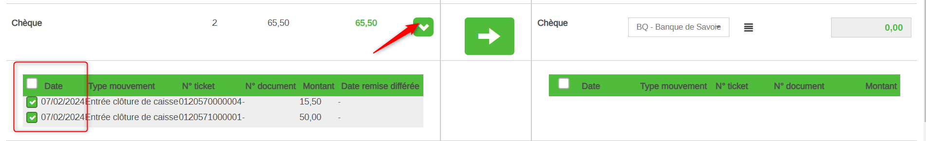 Pour les chèques, on peut voir le détail des chèques qui composent le montant global de 65.50€ en cliquant sur la flèche qui descend. Ici lors de la clôture on a indiqué avoir encaissé deux chèques de 15.50€ et 50€.