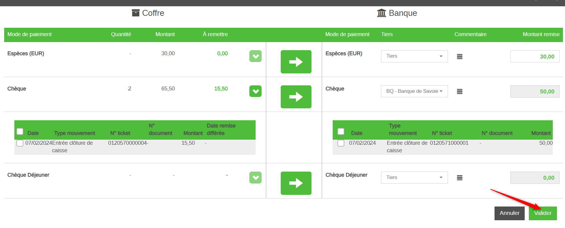 Pour Mettre en banque ce montant, il suffit de cliquer sur la flèche verte au milieu. Le montant remise passe ainsi de 0 à 30 :