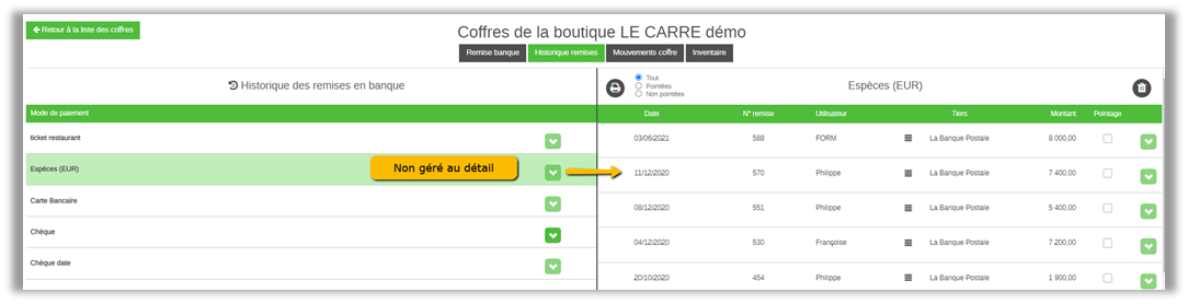 On peut néanmoins accéder aux différentes remises en banque dans la partie droite.