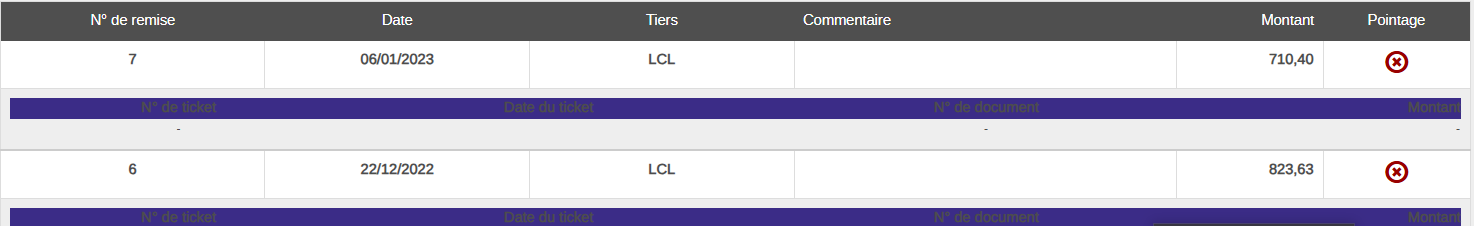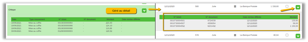Pour ceux gérés au détail (généralement les chèques), on retrouve pour chaque remise les éléments détaillés