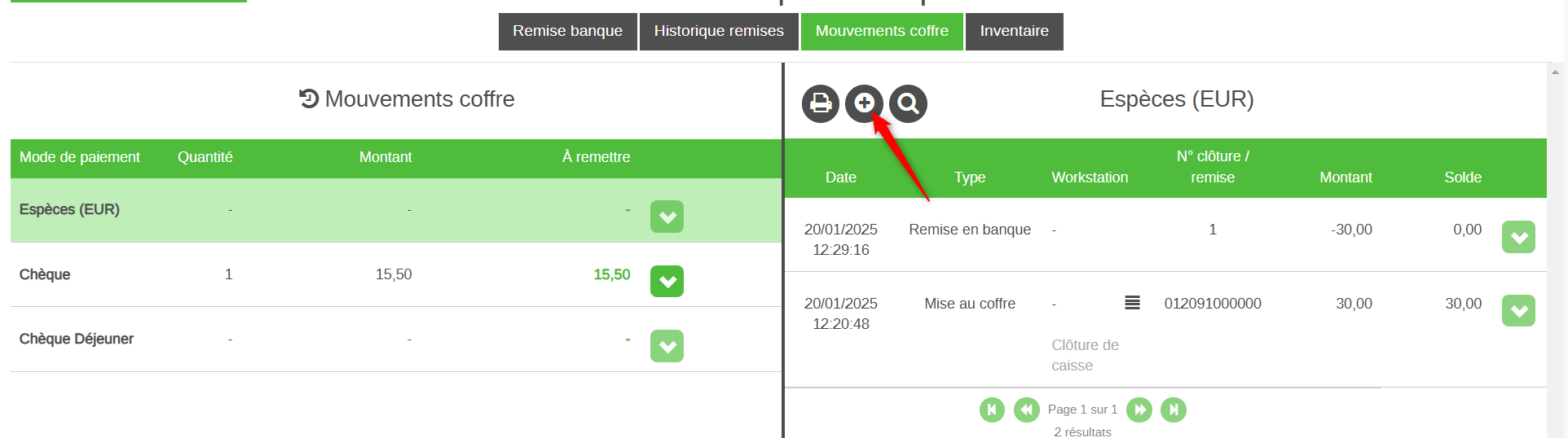 Ce module permet de suivre les montants prélevés du tiroir caisse au moment de la clôture de caisse et qui sont stockés dans le coffre (réel ou fictif) avant d’être remis en banque. Cela permet donc d’avoir informatiquement le montant théorique disponible au coffre et de réaliser les mouvements de remises en banque et de suivre leurs historiques dans le logiciel.