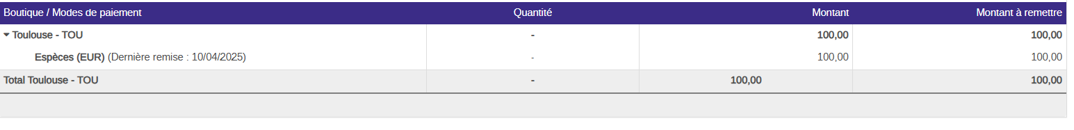 - Un état des remises en banque : dans ce report vous trouverez la liste de toutes les remises en banque sur une boutique et une période au choix, pointée ou non pointée et par mode de paiement.