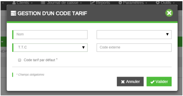La première étape consiste à créer les codes Tarif : vous définissez un nom, vous précisez s'il s'agit d'un tarif HT (appliqué pour les professionnels) ou d'un tarif TTC (appliqué pour les ventes aux particuliers).