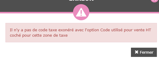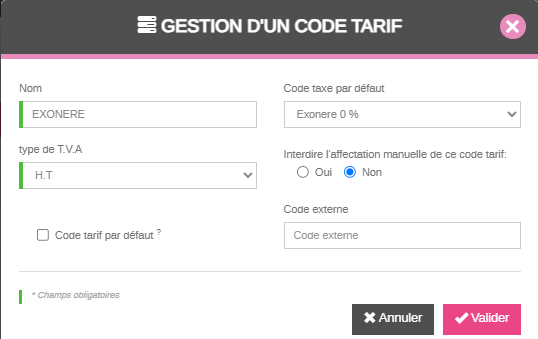 La liste des codes tarifs existants apparaît. Cliquez ensuite sur le code tarif exonéré pour faire apparaître la modale ci-dessous :