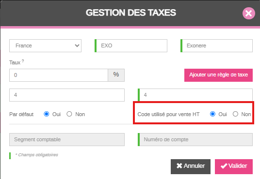 Sélectionner le bouton “oui” sur la ligne “code utilisé pour vente HT”., puis valider.