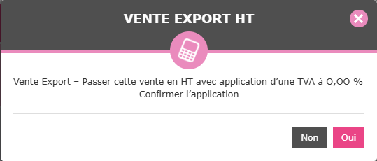 Il est également possible d’exonérer la totalité du ticket de la TVA. Pour ce faire, cliquer sur la ligne du total puis sur le bouton. La même modale apparaît, cliquer sur oui.