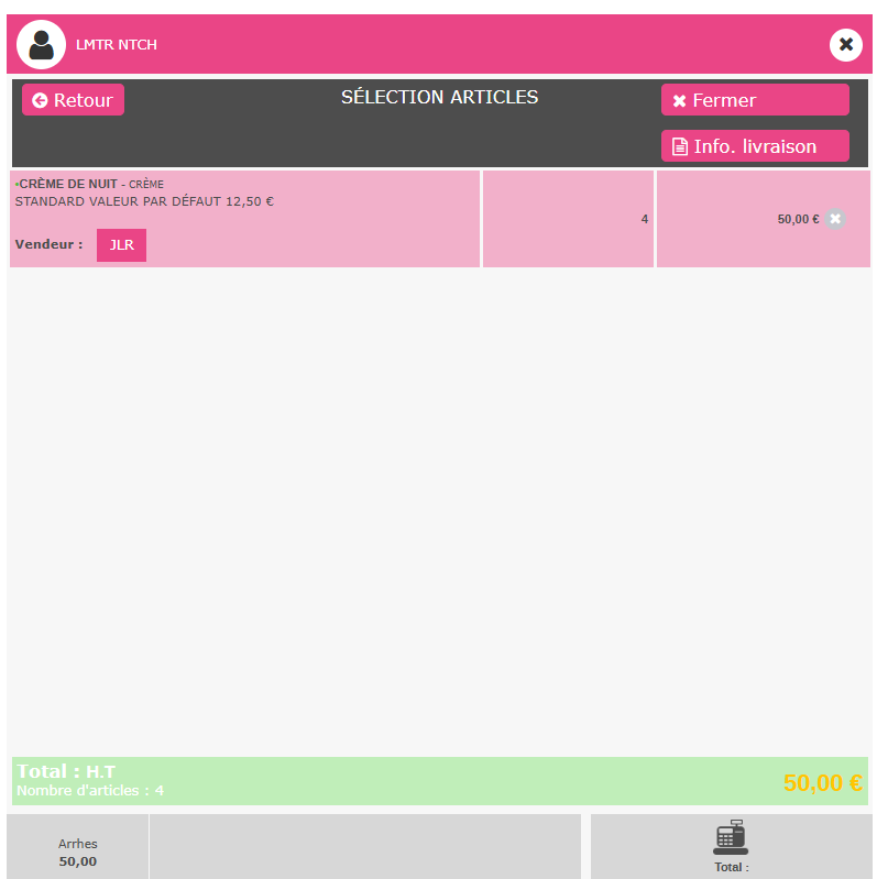 Il est également possible d’exonérer une commande de la TVA. Pour ce faire, ouvrir la commande puis cliquer sur Livrer. Cliquer ensuite sur Encaissement. Lorsque le ticket propose de cliquer sur “total” en bas à droite, on peut alors appliquer l’exonération de TVA sur les articles concernés ou directement sur la ligne du total du ticket.