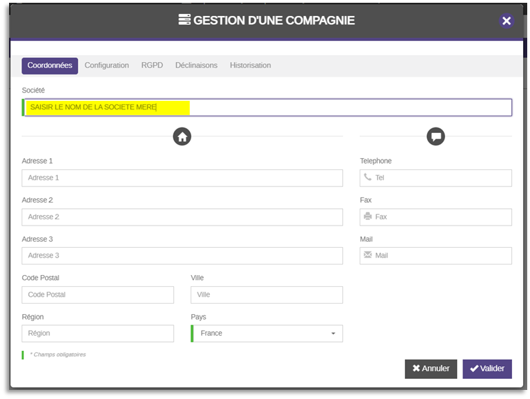 - Saisissez les champs obligatoires à minima : Nom de la société ou société mère s’il y en a une