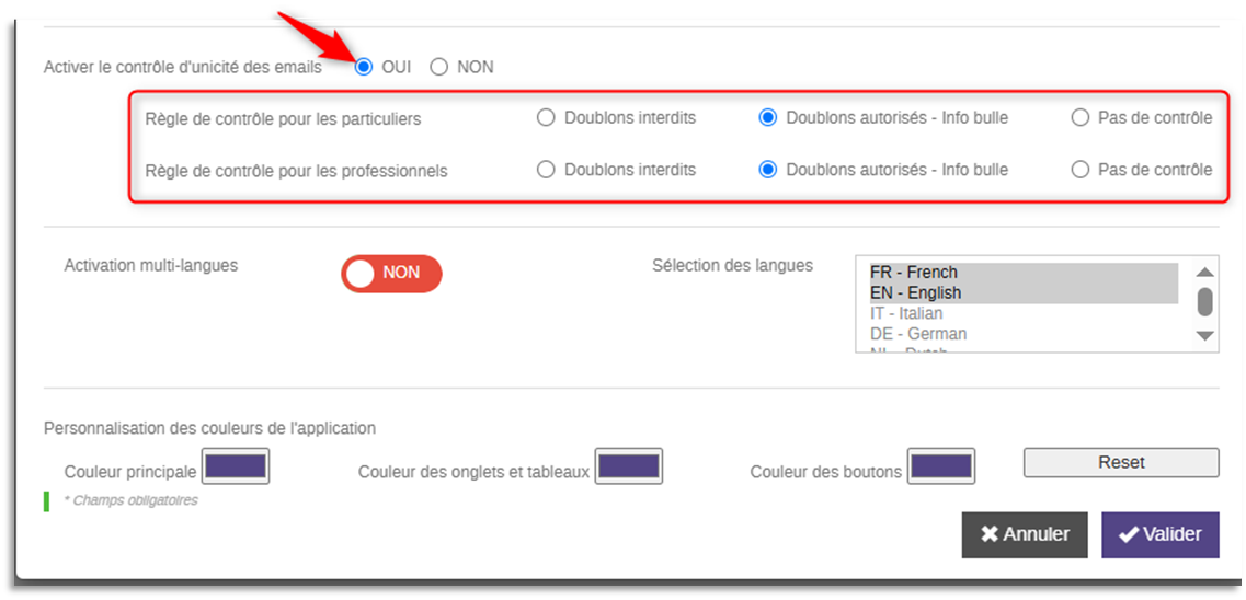 Cliquez sur l’onglet « Configuration » En bas de l’écran, vous avez la possibilité d’activer le contrôle d’unicité des emails pour éviter la création de doublons de clients