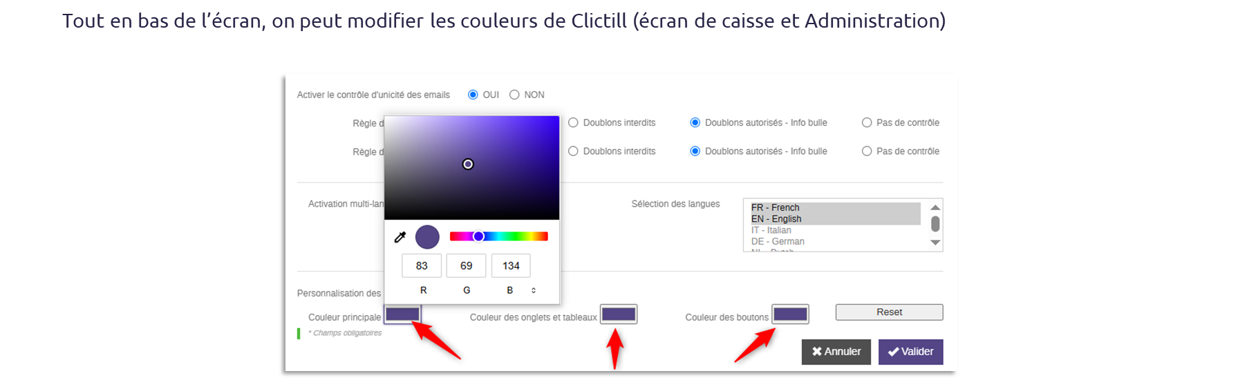 Tout en bas de l’écran, on peut modifier les couleurs de Clictill (écran de caisse et Administration)