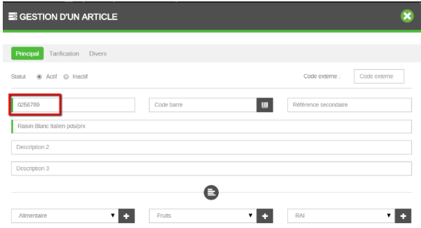 Les 7 premiers digits correspondent donc à la référence de l'article. C'est ce code qui doit être renseigné dans le champ " Référence " de la fiche article.