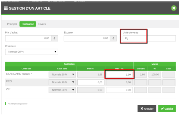 Pour leprix, dans notre exemple on spécifie le prix au KG. Ici : 1.99€