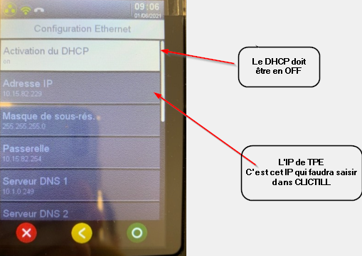 L’IP du TPE doit être impérativement être fixe. En effet il existe un risque que l’IP change au fil du temps le cas échéant et donc que la connexion ne soit plus fonctionnelle Ce paramétrage doit être fait avec le responsable technique, chez vous, sur votre Box ou votre FireWall