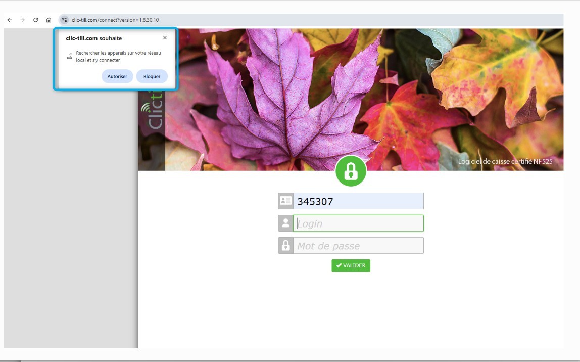 Dès qu’on se connecte à l’application Clictill, le navigateur affiche une demande d’autorisation du type « clic-till.com souhaite rechercher les appareils sur votre réseau local et s’y connecter » (voir la capture ci-dessous).